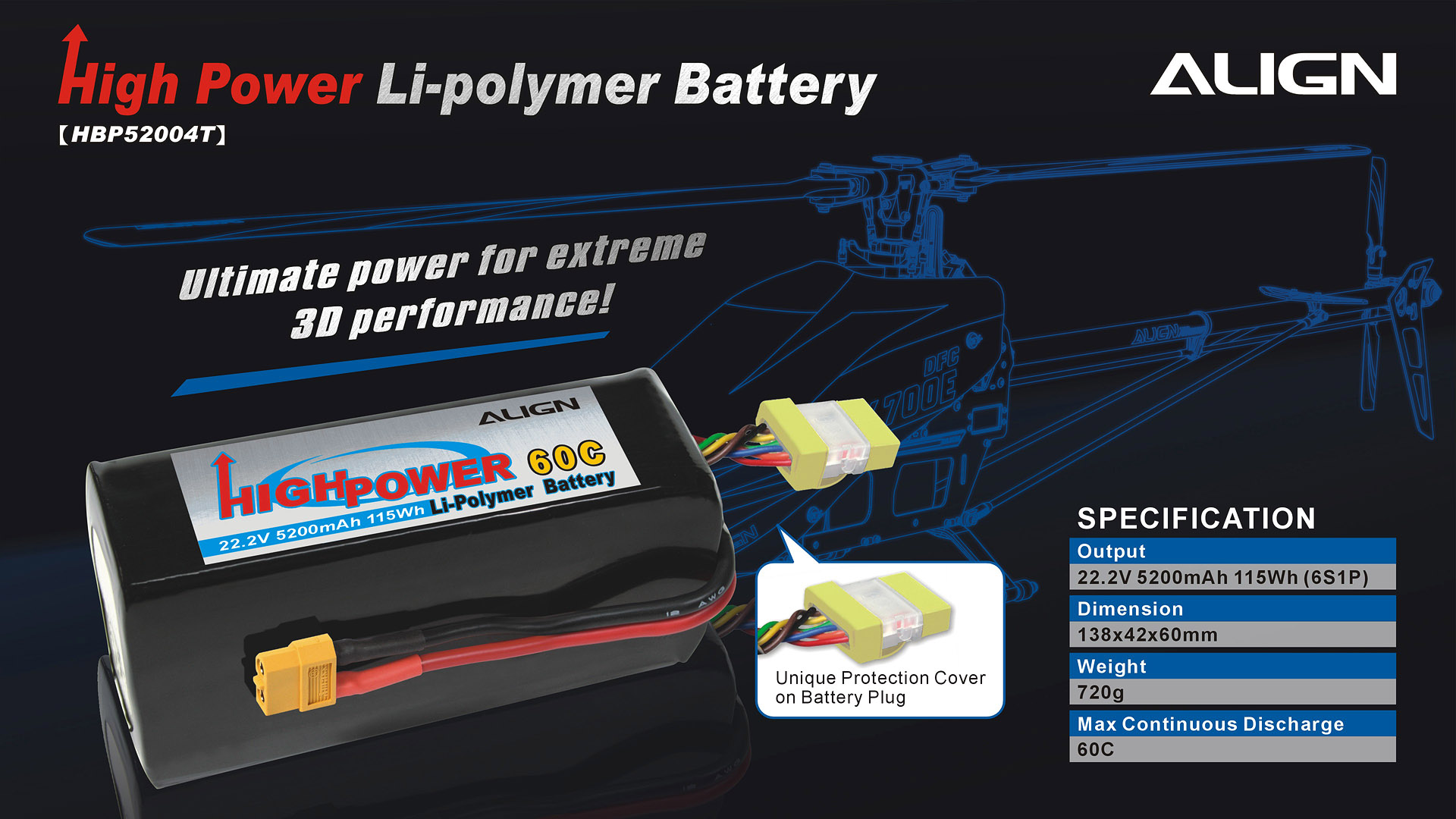 | ●These high discharge lithium polymer batteries are designed to maintain performance in series configuration, and can be charged individually through balancing plug. The extreme high capacity are catered specifically for applications requiring longest flight duration, Suitable for TB70 / T-REX 550~T-REX 800 extreme maneuver flight needed. ●Max Continuous Discharge: 60C. Normal operating temperature is approx. 40-65°C(within 80% of rated discharge). Max. temperature: 80°C. ●Recommend to discharge the battery within 80% of rated discharge, keep 95% capacity when over 100 cycles, keep 90% capacity when over 150 cycles.(The cycle life and efficiency will reduce due to high current, high temperature and over-discharge) NOTE: When using high energy Li-poly Battery, please do not over-discharge,over-charge batteries, or result over-high temperature. Discharging capacity can’t exceed 80% of the max capacity after full charging to ensure a good cycle performance.Recommend to full charge a brand new battery before using and only discharge the battery 50% for first 5 times to make a good efficiency of the battery. Please make it a habit to always count time for flight, or please set a low voltage protection on ESC (Cell voltage after stopping using can not lower than 3.4V). Do not use the battery at insufficient of voltage. Do not expose batteries to sunshine or store/ charge batteries at the temperature up to 35℃ in a airtight car. The environment high temperature could cause the damage or the danger of burst. If the battery becomes hot while high current discharging or flying, please do not charge the battery immediately. Wait to cool down(about 20 mins), then inspect to recharge. If against follow the original factory using rules, possibly cause the battery to inflate or any dangerous accident happens. Do not leave the charger is operating unattended as it may cause a fire. Charging error could result in battery explosion, fire, and other unexpected danger or property loss. Please always charge batteries with equipment in sight, do not leave charger unattended. Should you need to leave the charging area, please remove the battery and abort charging process. | ●Output:22.2V 5200mAh 115Wh (6S1P) ●Support 5C charging. ●Dimension:138x42x60mm ●Weight:780g(Including connectors) ●Max Continuous Discharge:60C ●Using 10AWG wire,thermal resistance:200°C, max continuous current 140A. ●Amass XT60-F Connector |